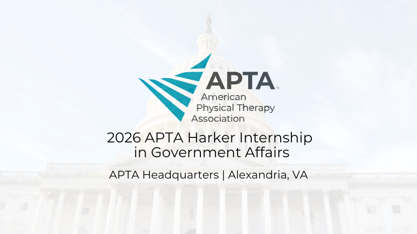 The APTA Harker Internship is an annual paid internship in Government Affairs for third year DPT students (if you are in a 2-year program, then your final year). The internship duration is approximately 6-8 weeks, usually during the late spring/early summer timeframe, and provides experience in federal legislative advocacy, policy, and grassroots. One student is selected each calendar year.