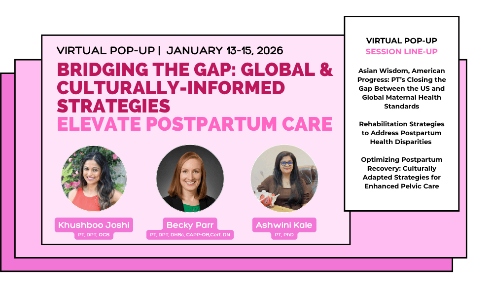 Are you passionate about pelvic health physical therapy and dedicated to advancing postpartum care? This special event will spotlight postpartum care through evidence-based strategies and cultural understanding. Explore rehabilitation approaches that address maternal health disparities and improve outcomes, examine how Eastern and South Asian fourth-trimester practices can inform U.S. maternal health standards, and discover how culturally adapted pelvic care strategies can enhance both physical recovery and emotional well-being. Together, these sessions provide valuable insights to support more equitable, culturally sensitive, and effective postpartum care.