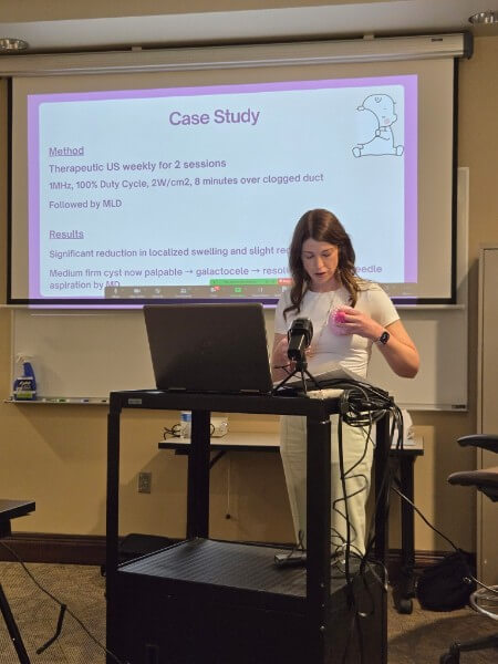 What stood out most to me was not only the effectiveness of the intervention but also how clearly it demonstrated the role of physical therapy in lactation care. Dr. Dobbins also provided a live demonstration, and I had the opportunity to volunteer as the patient, which made the experience even more meaningful. This session reinforced that pelvic health physical therapists are uniquely positioned to contribute to breastfeeding support through both manual therapy and modality-based interventions.